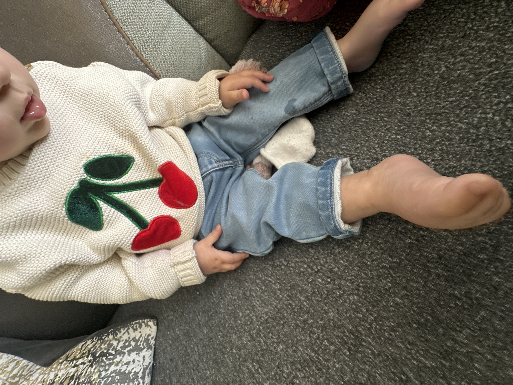 A baby wearing a white sweater with cherry appliqués and blue jeans lies on a gray textured surface. One foot is bare and exposed, the other covered with a patterned sock. A small hand rests on a knee of the jeans. A cushion is behind the baby. The baby's tongue sticks out slightly.