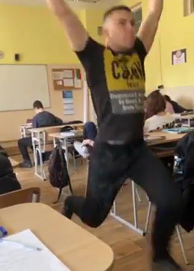 young man in a classroom, possibly a student. He is standing near the front, facing the camera, and is wearing a black t-shirt with a yellow design, black pants with pockets on the legs, and athletic shoes. The man is flexing his arms and striking poses. Other students are seated at desks and appear to be working. The classroom has yellow walls, desks, chairs, and a whiteboard.