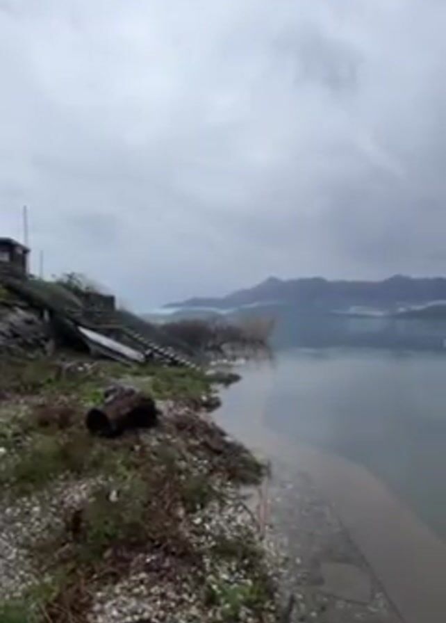 The camera, set low to the ground, pans slowly right across a rocky, overgrown shore of a wide lake on a heavily overcast day. The shore is made up of small gray rocks and short weeds. A dark log rests near the foreground. A short cement retaining wall is partially submerged. Steps lead upward from the shore toward a small structure on the left. Across the still water are distant mountains, their bases obscured by clouds. Some small yellow buoys are visible in the water. The surface of the water reflects the gray sky.