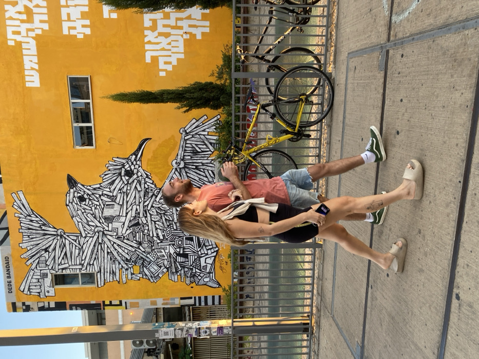 This image captures a late afternoon urban street scene on Derech Menachem Begin 121, Tel Aviv, Israel. Two individuals, a female and a male, walk from left to right on a concrete sidewalk, illuminated by warm golden hour light. The female, positioned slightly ahead and to the left, has long, light brown hair and wears a black sports bra, black athletic shorts with a light stripe, and light beige slip-on sandals. A white long-sleeved shirt is draped over her left shoulder, and she holds a dark smartphone vertically in her left hand. A faint tattoo is visible on her left forearm. The male, with short brown hair and a light beard, walks to her right. He wears a coral-colored t-shirt, light blue ripped denim shorts, white socks with a Nike swoosh, and dark green Vans sneakers. He holds a light-colored cup or bottle in his left hand. Both individuals gaze forward, the male's mouth slightly ajar as if speaking. In the background, a vibrant yellow building facade features a prominent black and white mural of two birds composed of architectural elements, such as small houses and geometric shapes. The artist's name, "DEDE BANDAID," is visible at the top left corner of the mural. To the right of the mural, white Hebrew script is painted vertically on the yellow wall, below which are two narrow windows and two tall, slender green trees. A grey metal fence separates the sidewalk from a paved area beyond. Two bicycles are parked against this fence: a bright yellow road bicycle with multiple gears and a darker-colored mountain bicycle. A grey utility pole with some affixed stickers is visible on the far left of the frame.