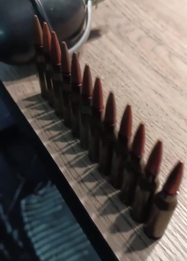 row of ammunition and a black grenade on a wooden surface. The ammunition cartridges have red tips. The grenade is black with a silver pin. The camera slowly pans across the scene. The background is blurred.