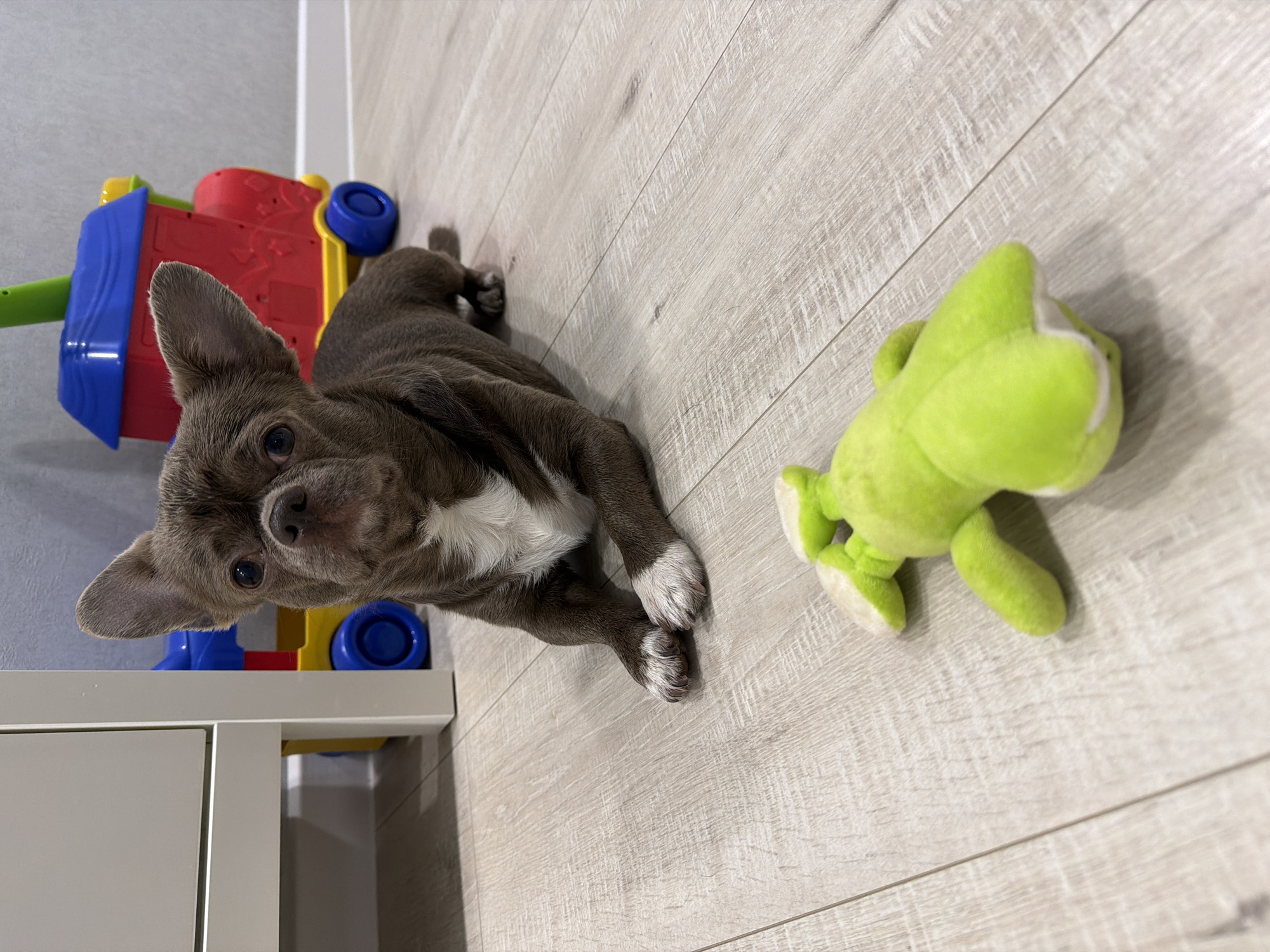 - "A small, gray-brown chihuahua dog with white markings on its chest and paws lies on a light-colored wood-grain floor next to a lime green stuffed frog toy" by FM-MNll92, licensed under CC BY 4.0