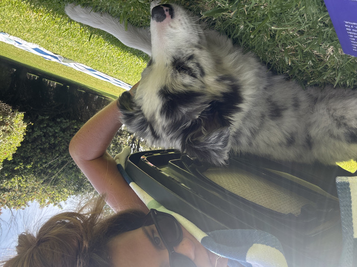 A woman lies on her back outdoors, partially visible in the lower portion of the frame. She wears sunglasses and has her hair pulled back. A spotted dog lies on top of her, its head close to her face. Green grass surrounds them, and a partially visible fence and trees are in the background. The lighting is bright, suggesting a sunny day. Part of what appears to be a cooler and a blue and white striped towel is visible beneath the dog and woman.