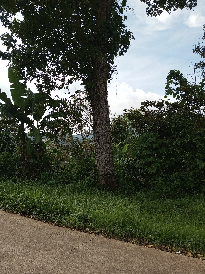 The image portrays an outdoor natural environment in Kandenuwara, Sri Lanka. A light grey paved surface, consistent with a road or path, occupies the lower left quadrant, extending diagonally towards the mid-right. Adjacent to the paved surface lies a strip of green grass and assorted herbaceous plants. A prominent, large-trunked tree with dark, textured bark stands slightly right of the frame's center, its dense green canopy extending into the upper left. Several thin, fibrous strands are observed hanging from its upper branches. To the immediate left of this central tree, multiple banana plants with broad green leaves are visible. The midground and background are characterized by a dense expanse of various green trees, shrubs, and undergrowth. Distant, tree-covered hills are faintly discernible on the horizon beneath a partly cloudy sky. The upper right segment of the sky is blue with scattered white cumulus clouds. No individuals, animals, specific actions, or direct interactions are visible within the frame. The only discernible man-made object is the paved surface.