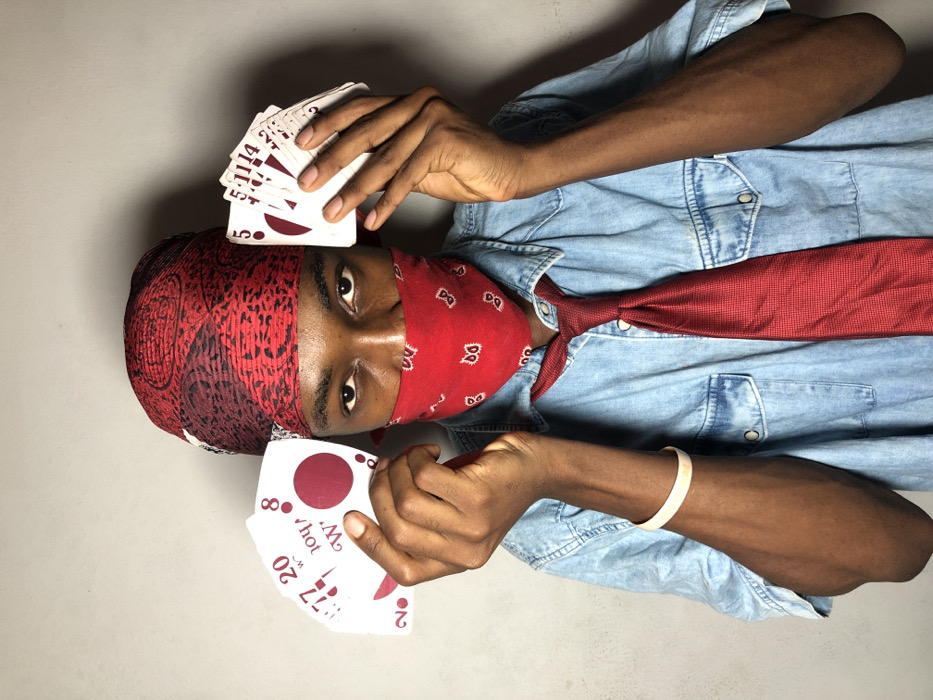 A dark-skinned individual is depicted from the chest up against a plain light grey wall. The subject wears a red patterned head covering, a red bandana masking the lower half of their face from the nose down, a light blue denim collared shirt with two breast pockets, and an untied red patterned tie. A light-colored bracelet is visible on the subject's left wrist. The subject's eyes are open and directed towards the viewer. In the left hand, four white playing cards are fanned out, partially displaying the numbers "77", "20", "W'", and "8", with one card featuring a large red circular design. In the right hand, several white playing cards are fanned, showing the numbers "5", "1114", and "2", with red heart suit symbols visible. Both sets of cards appear oriented upside down from the viewer's perspective. The scene is located in Accra, Ghana.