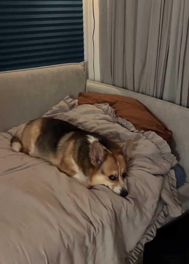 - "A Corgi dog lies on a bed with gray ruffled bedding" by FM-4GKkh1, licensed under CC BY 4.0