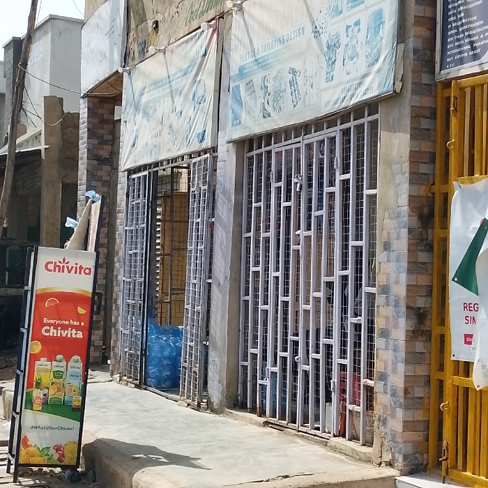 This image depicts a street-level view of a commercial section in Dan Maliki, Nigeria, under bright daylight conditions. The scene features multiple storefronts with visible security gates and informational banners. On the left, a "Chivita" branded A-frame sidewalk sign, predominantly white and orange, displays images of various juice products and slogans like "Everyone has a Chivita." Adjacent to this, a shop entrance features a white metal security gate, with one panel pulled back, revealing blue tarp-like material or sacks inside the dimly lit interior. To the right, another shop is secured by a fully closed white metal security gate composed of vertical and horizontal bars. Above this shop, a large, light-colored banner is affixed to the building, displaying text such as "TEXTILE & TAILORING DESIGN" alongside illustrations of garments and patterns. Further to the right, a bright yellow metal gate, possibly for an additional establishment, is partially visible. Attached to this gate are two banners: a white one with green text and a green graphic, showing "REG" and "SIN," and another white banner with black text listing various services including "DATA SUBSCRIPTION," "NIN REGISTRATION," "BVN REGISTRATION," "ID CARD," "INTERNATIONAL PASSPORT," and "BUY CRYPTO ASSET." The building facades exhibit a combination of light-colored brickwork or tiling on the lower sections and plain concrete or painted surfaces above. Overhead light fixtures are mounted on the building. The sidewalk in the foreground is paved, and strong shadows are cast, indicating the time of day. No individuals are visible in the frame.