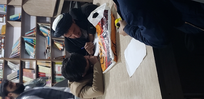 The image depicts an indoor scene within a library or study area located in Kandahar, Afghanistan