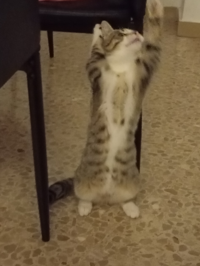 - "A tabby cat stands on its hind legs on a speckled floor, reaching upward with one paw raised in the air" by FM-79Pgs2, licensed under CC BY 4.0