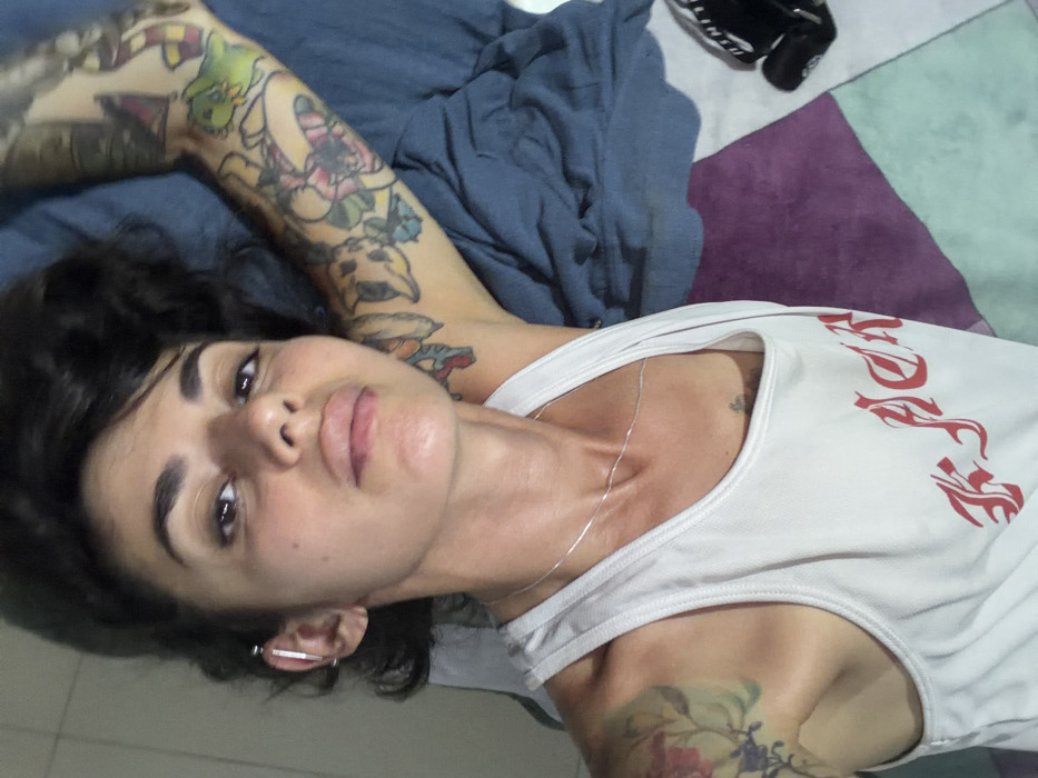 A female subject is depicted in a close-up, top-down shot, appearing to be taking a selfie while lying on her back. She has dark, wavy hair, brown eyes, and full lips. A silver-toned bar earring is visible in her left ear, and a thin silver-toned chain necklace is worn around her neck. Her right arm, visible from the shoulder to the forearm, is extensively covered with colorful tattoos featuring various cartoon-like characters, floral elements, and patterns, including a green creature and a red-and-yellow serpentine design. Additional tattoos are visible on her left shoulder and sternum. She wears a white tank top with red lettering that appears to spell "KRAK." The immediate background consists of crumpled blue fabric, consistent with bedding. To the lower right, a multi-colored fabric, possibly a patterned blanket or rug with sections of purple, light blue, and white, is visible. A dark object, likely a shoe or accessory, rests on this fabric in the bottom right corner. The scene is indoors. The specified location of Nusa Dua, Indonesia, cannot be verified from the visual information presented in the image.