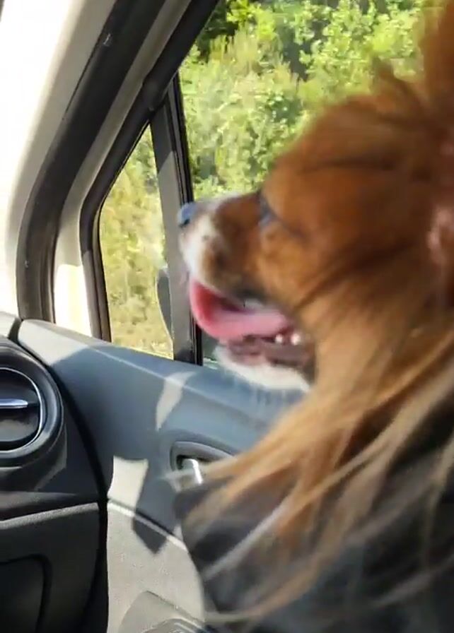 interior of a car driving along a road with mountainous terrain. The camera appears to be placed on the dashboard, providing a view of the road ahead, and occasionally showing a small brown dog with its head out of the driver's side window. The dog appears to be panting and enjoying the air. Other cars can be seen on the road. The landscape consists of green mountains and vegetation. The sky is blue with some clouds. A road sign with an exclamation point is visible through the open window in the initial frame.
