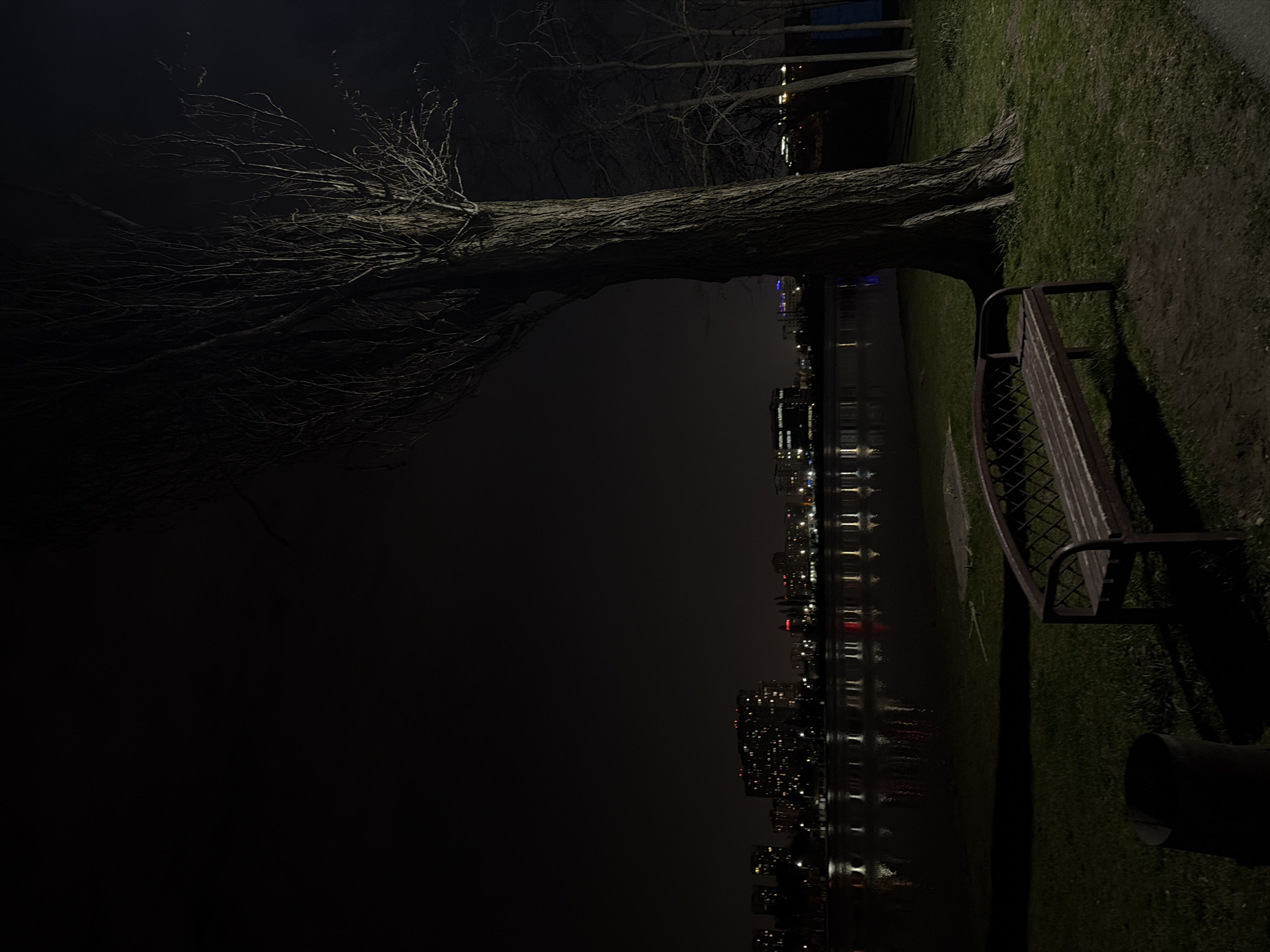 The image depicts a nighttime scene in a park area bordering a body of water in Krasnodar, Russia. In the immediate foreground, a dark brown, slatted park bench with metal armrests is positioned on a grassy surface. To the left of the bench, a dark, cylindrical object, possibly a waste bin, rests on the grass. A large, bare-branched tree with textured bark stands prominently on the right side of the frame, its trunk partially illuminated from the right, casting a shadow towards the left. The ground consists of grass and some areas of exposed earth. In the midground, a dark expanse of water, likely a lake or wide river, reflects numerous artificial lights from the distant cityscape. The background reveals the illuminated skyline of Krasnodar, characterized by multi-story buildings with numerous lit windows, streetlights, and several prominent red lights on building rooftops. The sky is dark, indicating night conditions. There are no individuals, explicit actions, or direct interactions visible within the scene.