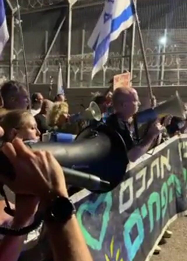 A group of people stand behind a banner near a tall wall topped with barbed wire. Several people hold up Israeli flags. Many people hold and speak into megaphones. The banner has Hebrew writing on it and images of hearts and lightning bolts. The sky is dark.