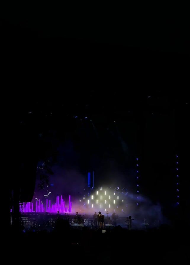 crowded concert stage with vibrant lighting. The stage is dark except for the lights illuminating it. A large screen displays a performer singing while playing a keyboard. The crowd is visible in the foreground, silhouetted against the bright stage lights, suggesting a large audience enjoying the music. Overall, the scene captures the energy and excitement of a live concert event.