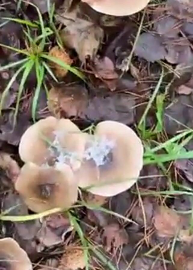 The video displays a close-up shot of several mushrooms growing on the forest floor amidst fallen leaves and blades of grass. The mushrooms are pale tan in color, with darker brown centers. Some of them have a crystalline substance, possibly ice or frost, concentrated in the center of their caps. The surrounding environment is covered in fallen leaves, pine needles, and patches of green grass. The lighting is diffused, suggesting an overcast or shaded environment. There are no people or interactions visible in the video.