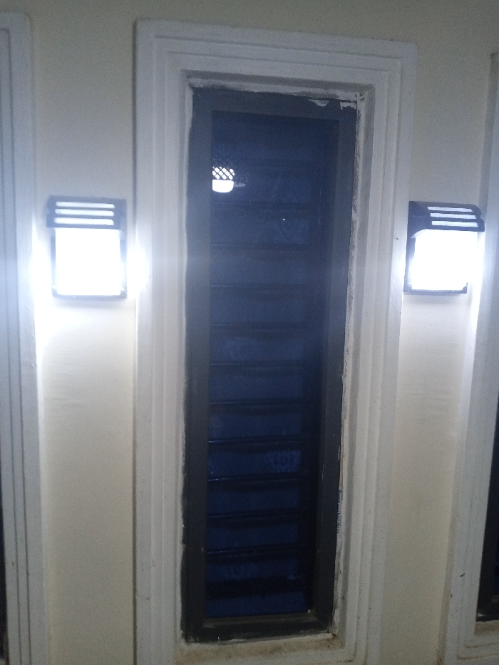 A pair of rectangular windows are framed by an off-white wall. Each window is flanked by a bright, square light fixture. The windows themselves are dark, possibly due to a cover or tinted glass, and divided into sections by horizontal bars. The wall around the windows appears to be slightly textured, with decorative trim bordering both windows and the lights. The overall scene is dimly lit, emphasizing the contrast between the bright lights and the dark windows.