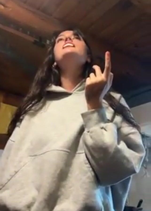A young woman with long brown hair, wearing a gray hoodie and matching sweatpants, is indoors under a wooden ceiling, singing and dancing while looking up. She has a nose piercing and shows her teeth while smiling. The room has a warm, wooden interior, and a clock is visible in the background.