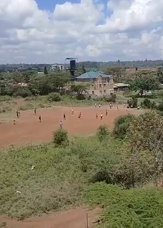 The video captures a wide shot of a dusty field where a group of people appear to be playing a game