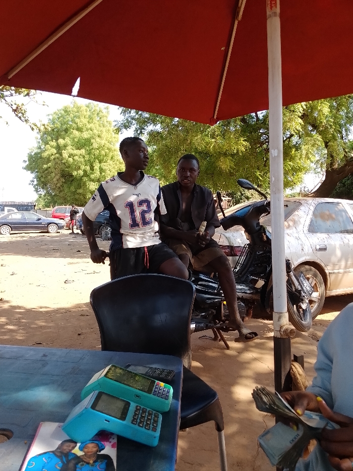 The scene depicts an outdoor commercial or gathering point in Yelwa, Nigeria