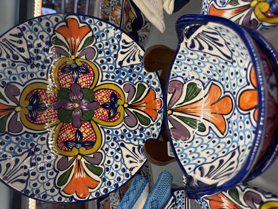 The image displays two distinct pieces of hand-painted ceramic pottery, characteristic of Mexican artisanry, presented in a retail display setting