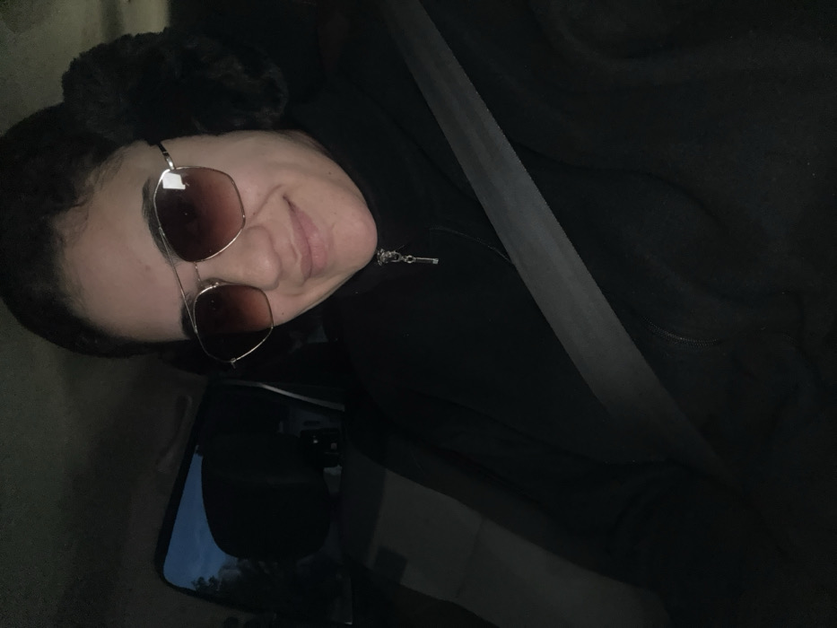 A person wearing sunglasses and furry earmuffs sits in a car. A seatbelt stretches diagonally across their body. The person is wearing a dark jacket. A car window is visible in the bottom left corner, reflecting a sky with some blue showing. The interior is dark with low lighting.