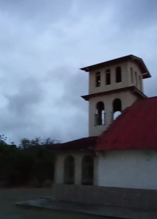 church with a white facade and a red roof, topped by a beige bell tower. The sky is overcast. A white truck is parked in front of the church, partially obscuring the view of the building. A basketball hoop stands nearby. The scene appears somewhat rural.