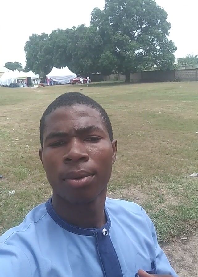 A young man wearing a light blue shirt with dark blue trim on the collar and placket is holding a camera and recording a video. He is standing in a grassy area with trees and white tents in the background. A cell phone tower is also visible in the distance. There are two tires leaning against a small tree. A building is visible over the trees. The sky is overcast with some clouds.