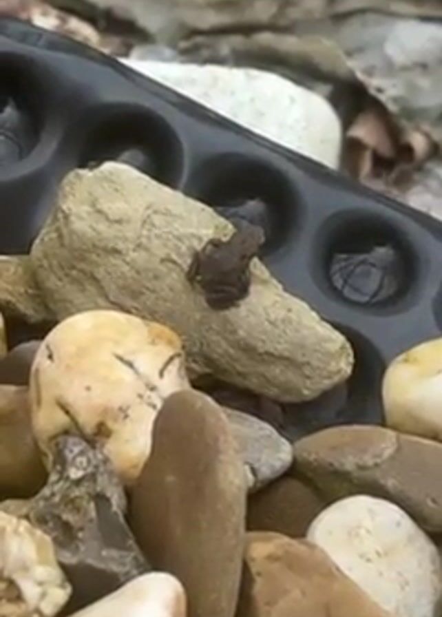 Here's a concise description of the video: The video focuses on a tiny, brown frog perched atop a small, light-colored rock. The rock is surrounded by an assortment of other rocks of varying sizes, shapes, and colors, including some that are white, tan, and speckled. A black, plastic object with a series of hemispherical depressions is partially visible in the background. The overall setting appears to be outdoors.