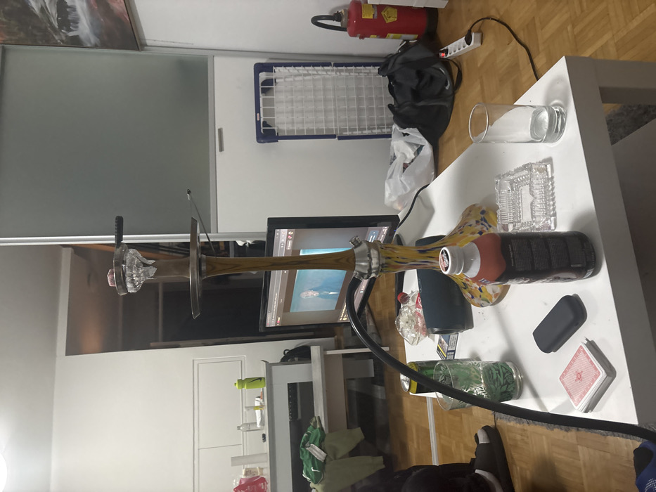 An indoor scene in a residential or common area in Krems an der Donau, Austria, depicts a casual, occupied space. The floor is composed of light-colored wood parquet. No individuals are fully visible; however, a person's left foot, wearing a dark slide sandal, is partially observed in the lower-left foreground. A prominent, tall hookah with a multi-colored yellow and red glass base and a wooden stem stands centrally on a white rectangular coffee table. Its bowl contains shisha tobacco covered with foil and a visible coal. A black hookah hose extends from the device, resting across various items on the table. On the coffee table, from left to right, are: a stack of red-backed playing cards; a small black rectangular object; a clear glass with ice cubes and a green liquid or pattern; a partially visible green aluminum can; a pack of Rothmans cigarettes; a clear plastic container with minor debris; a brown bottle with a white cap; a clear glass ashtray; and an empty clear drinking glass with residual liquid. In the midground, behind the coffee table, a black computer monitor displays a video featuring a man's face. To the left of the monitor, a white console table or bench is positioned against a white wall, holding a folded green garment, a light green sports bottle, and other small items. A doorway reveals a darker interior room beyond. To the right of the monitor, a blue and white folding clothes drying rack leans against a white wall. Below it, a black duffel bag, a white plastic shopping bag, and a red fire extinguisher are situated on the floor. A white power strip with a black cable is plugged into an electrical outlet near the fire extinguisher. The background features a large white sliding door or partition, with a frosted glass panel on its right side. A framed artwork with abstract red and white forms is partially visible above the sliding door.