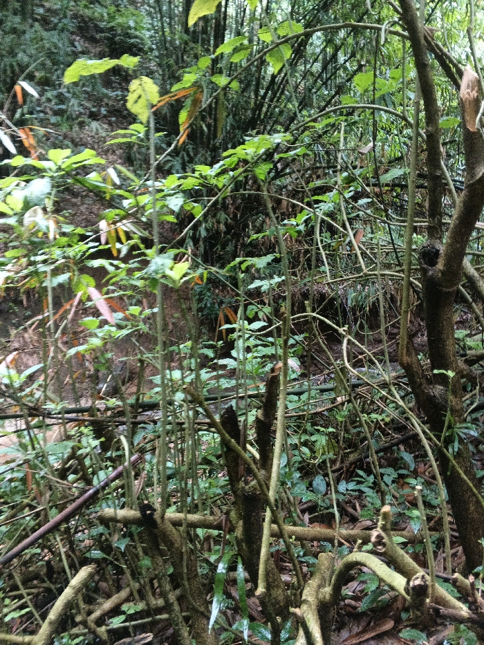 The image displays a dense, forested environment consistent with the terrain found in Baglung, Nepal. The foreground and midground are dominated by a complex network of multi-stemmed plants and coppiced stumps, characterized by numerous thin, vertical green shoots emerging from thicker, gnarled bases. Many branches exhibit freshly cut ends, indicating recent pruning or harvesting activity. Sparse green leaves are visible on the new growth, while some older leaves show yellowish-green or reddish-brown coloration. The ground beneath is covered with leaf litter and dark soil. In the background, a dense stand of tall, slender bamboo stalks forms a solid green wall, obscuring distant features. To the left, an earthen bank or slope is visible, partially covered with vegetation and disturbed soil. The scene is illuminated by diffused natural light, suggesting either an overcast condition or deep canopy cover. No individuals or manufactured objects are present within the frame.