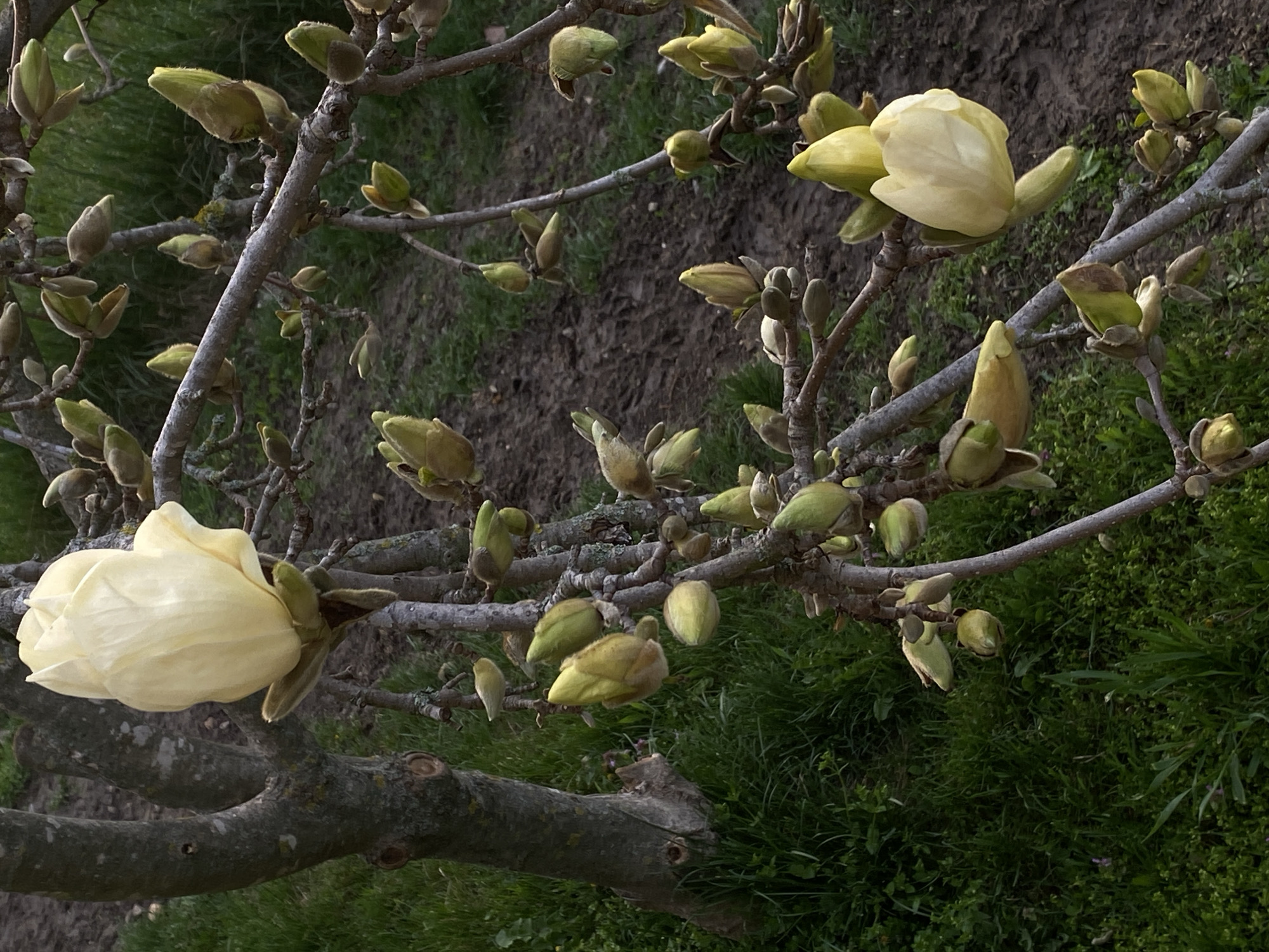 branch of a magnolia tree with several yellow-white blossoms and numerous buds. The branch is light gray and textured. The background includes patches of green grass and dark soil. The image appears to be taken at eye level, providing a detailed view of the magnolia tree's springtime bloom. The location is Dobri dial, Bulgaria.