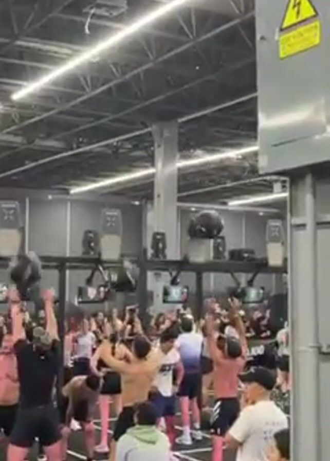 A large group of people are exercising in what appears to be a gym. Most of them are standing in rows and throwing large black exercise balls straight up into the air. Many of them are shirtless, while the others are wearing workout clothes. There are several large screens mounted to the wall, displaying timers and scores. There are other people watching the exercise, some of them recording the event with their phones. The gym has high ceilings, black walls, and bright overhead lights. There is also a large electrical box with warning signs attached to a support column.