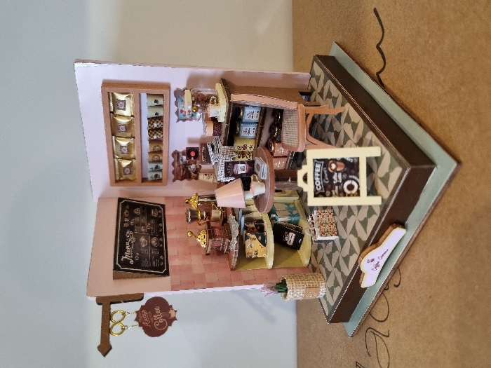 This image presents a detailed miniature diorama of a coffee shop interior