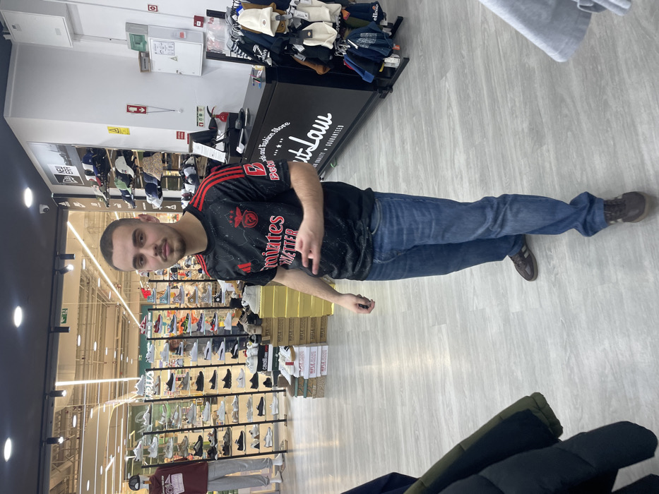 The image displays the interior of the "OutLaw Brands and Fashion Store" located in Mirandela, Portugal. A male subject stands centrally in the foreground, facing the camera. He has short, dark hair and a light complexion, with a thin mustache. He wears a black, short-sleeved athletic jersey with red stripes on the shoulders, a red circular emblem (consistent with the SL Benfica crest), white "Emirates Fly Better" sponsorship text, and red "Betano" sponsorship text. He is dressed in blue denim jeans and dark brown sneakers. His left hand is raised, forming a gesture with the index and middle fingers extended. His right hand holds a small, dark, rectangular object. The store's environment features light grey wood-effect laminate flooring and a white ceiling equipped with recessed lighting fixtures. In the background, multiple vertical display racks showcase numerous pairs of sneakers and casual shoes. A mannequin wearing a burgundy hoodie and light grey sweatpants stands to the left of these footwear displays. Stacked shoe boxes, some labeled "Cavalli" and "RIFLE," are visible on the floor near the displays. To the right, a black counter bears the white "OutLaw Brands and Fashion Store" logo, along with the text "SINCE 2017 QUALITY GUARANTEED." Above this counter, a wall-mounted display rack exhibits various hats, including "New Era" branded items. Adjacent to the counter, a black merchandise stand holds folded clothing and various beanies. A black security camera is mounted on the ceiling in the upper right quadrant of the image. A white wall area behind the counter displays utility panels and emergency signage.