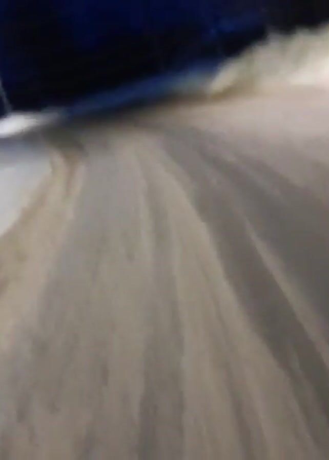 someone walking along a snow-covered road at night. The camera is pointed ahead, capturing the path illuminated by streetlights. There are large piles of snow on either side of the road. The sky is dark.
