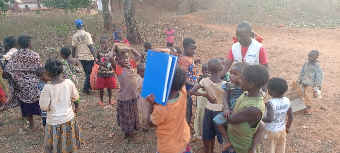 The image depicts an outdoor gathering in Konongo, Democratic Republic of the Congo, featuring approximately twenty-five individuals on reddish-brown dirt ground. The majority are children of varying ages, from toddlers to pre-teens, dressed in casual clothing. In the center-right, an adult male with a dark complexion wears a red t-shirt under a white vest bearing a blue humanitarian organization logo (likely UNICEF) and observes the children. Another adult male, wearing a light-colored t-shirt and blue cap, stands in the left-center background, carrying a dark bag. Multiple adult women are visible on the left, some in patterned wraps. Several children are actively carrying objects: one in the foreground holds a large blue binder, another balances a light-colored rectangular object on their head, and a child on the far right carries a cardboard box. The background features sparse, dry vegetation, including trees, and distant, low-rise structures with light-colored walls and dark roofs. The overall environment is an unpaved, open area consistent with a community space.