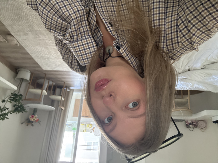 A woman with light brown hair and blue eyes looks directly at the camera. She wears a checkered shirt and a black necklace. The background is a bright, cozy interior. A bed with white sheets is visible to the right. A table with chairs and a plant stand near a window are seen to the left. Her lips have a glossy finish, and a pair of black-framed glasses is near her face.