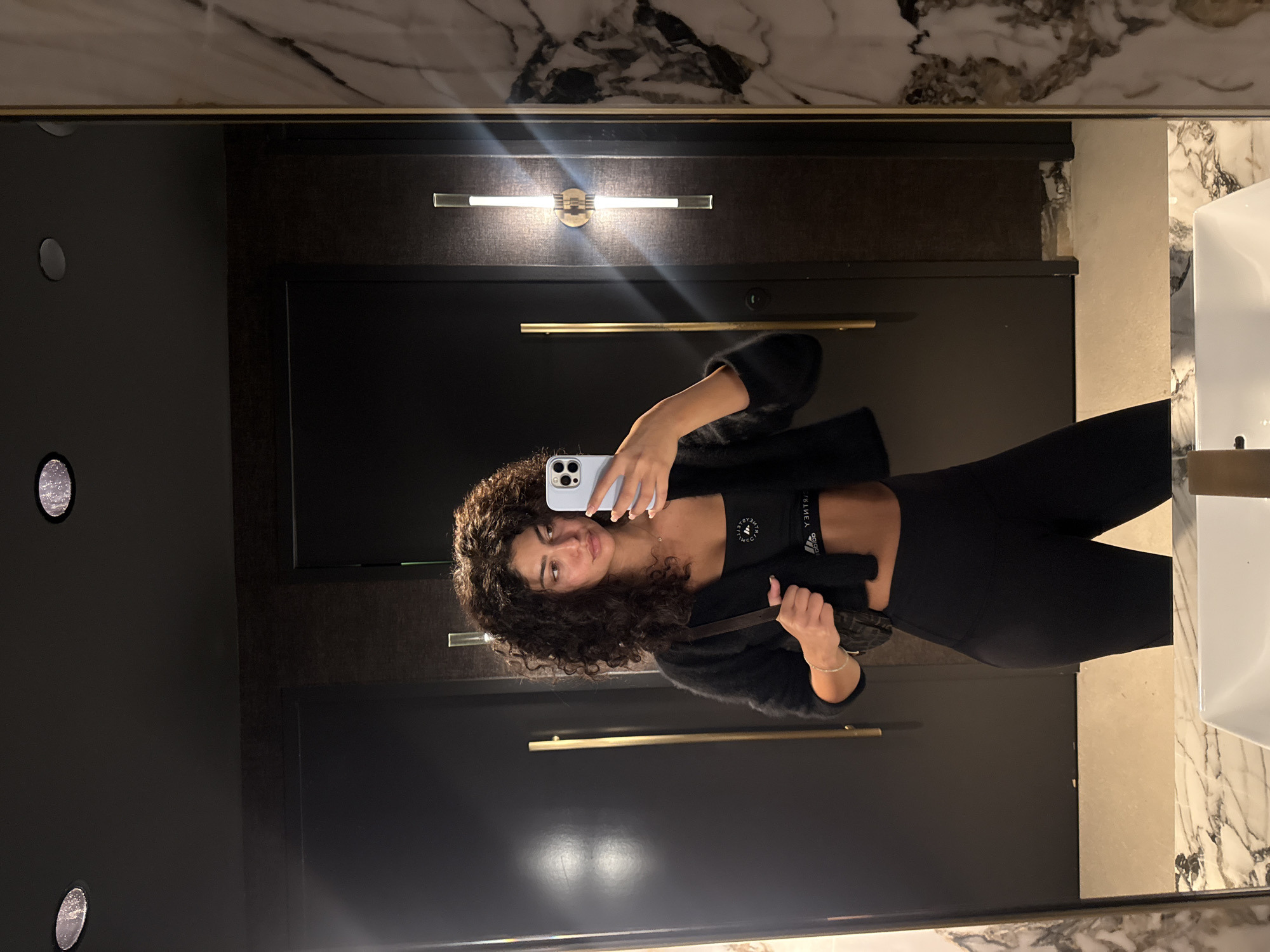 A young woman is taking a selfie in what appears to be a bathroom in West Hollywood, California. The woman has curly dark hair and is wearing black leggings and a matching black crop top with the Adidas logo visible. She is also wearing a black cardigan. She is holding a white smartphone in her right hand. The background includes a marble countertop with a white sink, a black wall with a horizontal gold handle, and a lit fixture. The scene is captured in a slightly rotated portrait orientation.