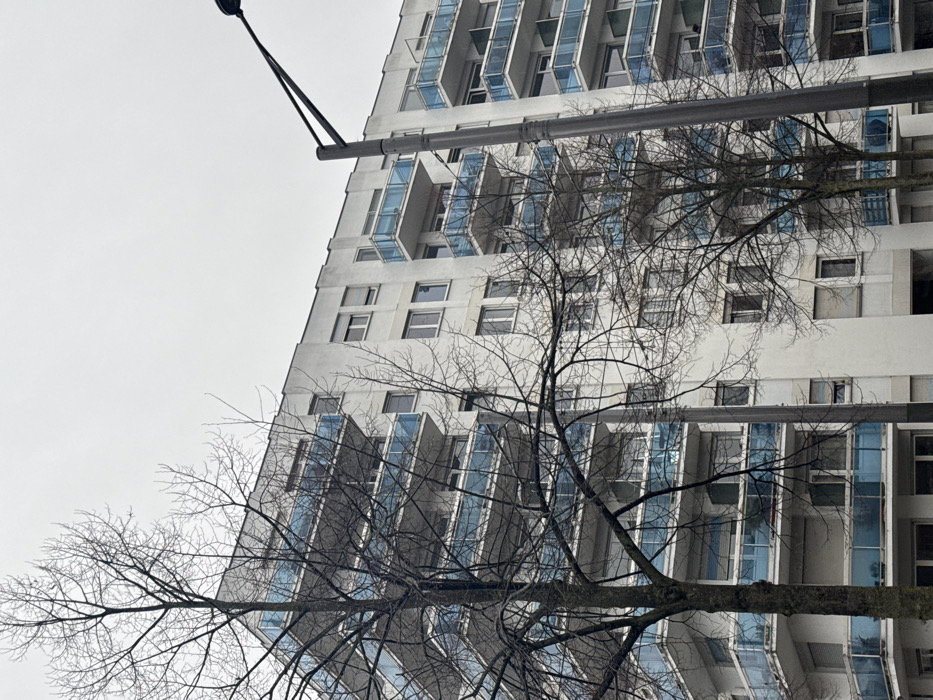 A tall, white building with blue-tinted windows and protruding balconies stands against a gray sky. The building is viewed from a low angle. Bare tree branches stretch across the foreground. A street lamp pole cuts through the upper left of the frame. The architecture of the building appears modern and unique.