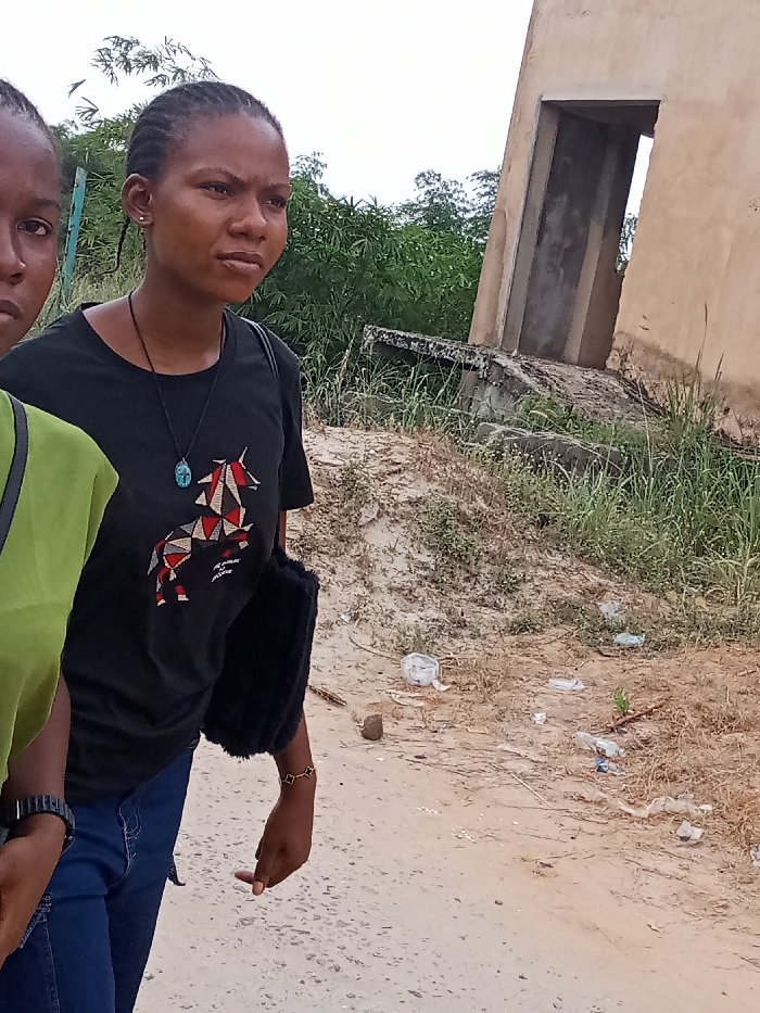 An outdoor scene depicts two individuals on an unpaved dirt path. The primary subject, a young Black female, stands in the foreground, slightly right of center, looking towards the right. She has braided hair and wears a black t-shirt with a multicolored geometric unicorn graphic, blue denim jeans, a black necklace with a turquoise pendant, and a black clover-charm bracelet on her right wrist. A black, textured shoulder bag hangs from her left shoulder. Partially visible on the far left is a second individual, showing the left side of their face, a green garment, and a black wristwatch. In the mid-ground to the right, a light-tan colored building, appearing unfinished or in disrepair, features an open rectangular doorway. Below the building, a concrete foundation is partially visible, interspersed with weeds and debris. Dense green vegetation forms the background. The ground is characterized by light brown soil, sparse green grass, and scattered litter including white plastic bags and bottles. The sky is overcast. No specific landmarks allow for precise identification of a location within the city of Owerri, Nigeria; however, the scene's general characteristics are consistent with semi-urban or developing areas in the region.