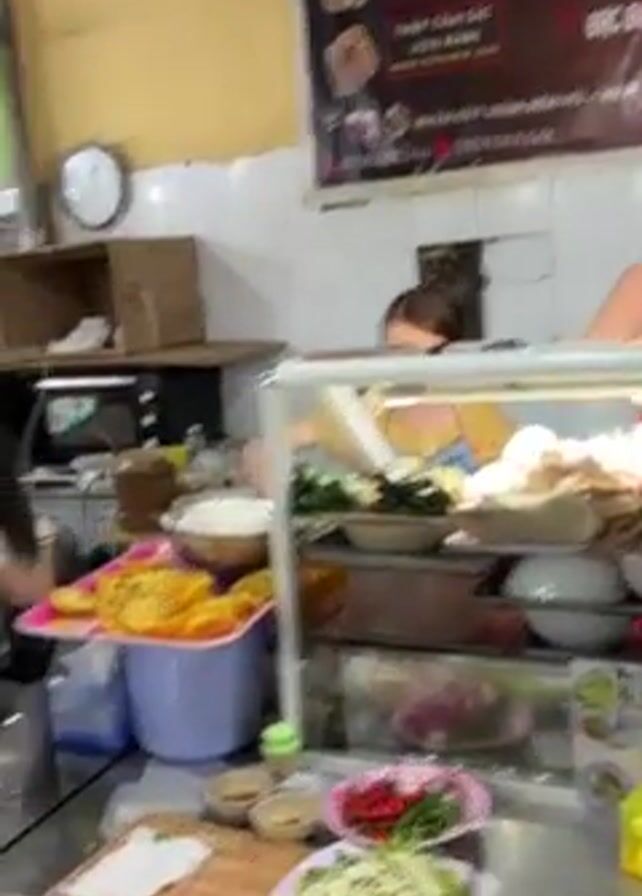 The video opens with a view inside a food stall, featuring a food display case with various ingredients