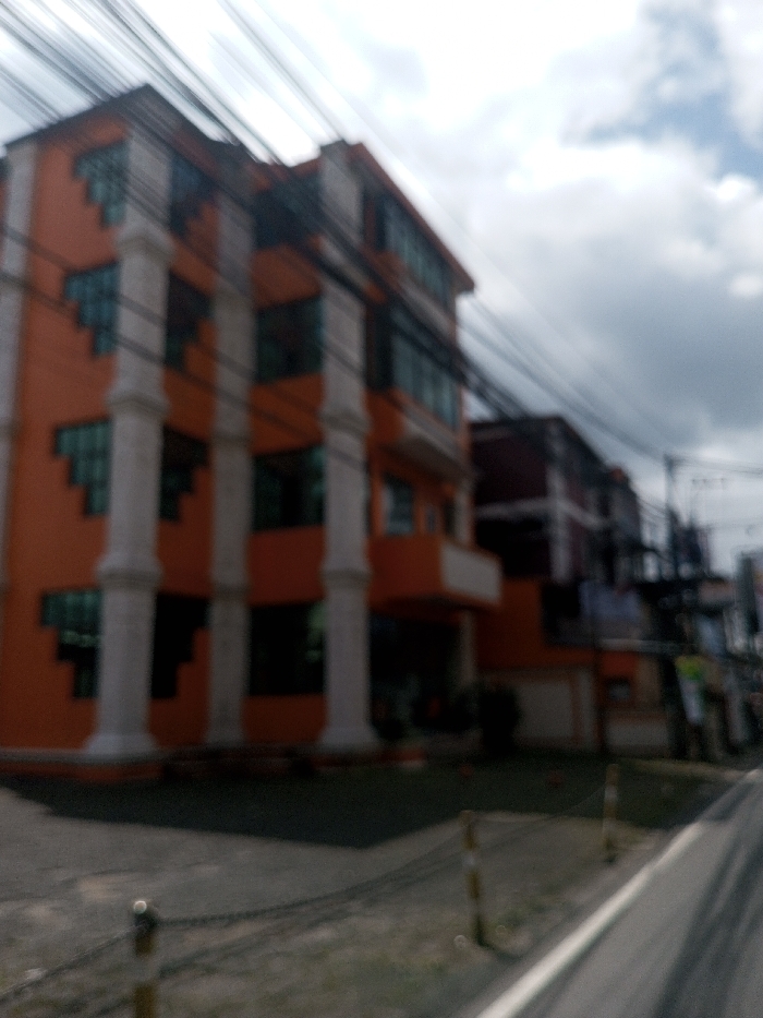 The image presents a blurry daytime street scene located in Gubbisamamidi, India. The primary subject is a multi-story building, appearing to have at least four visible floors, characterized by bright orange exterior walls. Four prominent white, classical-style columns ascend vertically across the building's facade. Numerous windows, some with a green or blue tint, are visible, with those on the upper floors featuring a distinct stepped or angled pattern along their top edges. A small orange balcony projects from a lower-middle floor on the right side of the main building's visible portion. To the right and slightly behind the primary structure, a second, darker multi-story building is partially visible. The upper area of the frame is crisscrossed by multiple black utility wires, set against a partially cloudy sky with discernible patches of blue. In the immediate foreground, a paved road with a white demarcation line is present. Along the left edge of the road, a series of low posts connected by chains or ropes form a barrier. The ground directly in front of the orange building appears dark green, possibly landscaping. No individuals, specific actions, or interactions are discernible within the frame due to the pervasive blur.