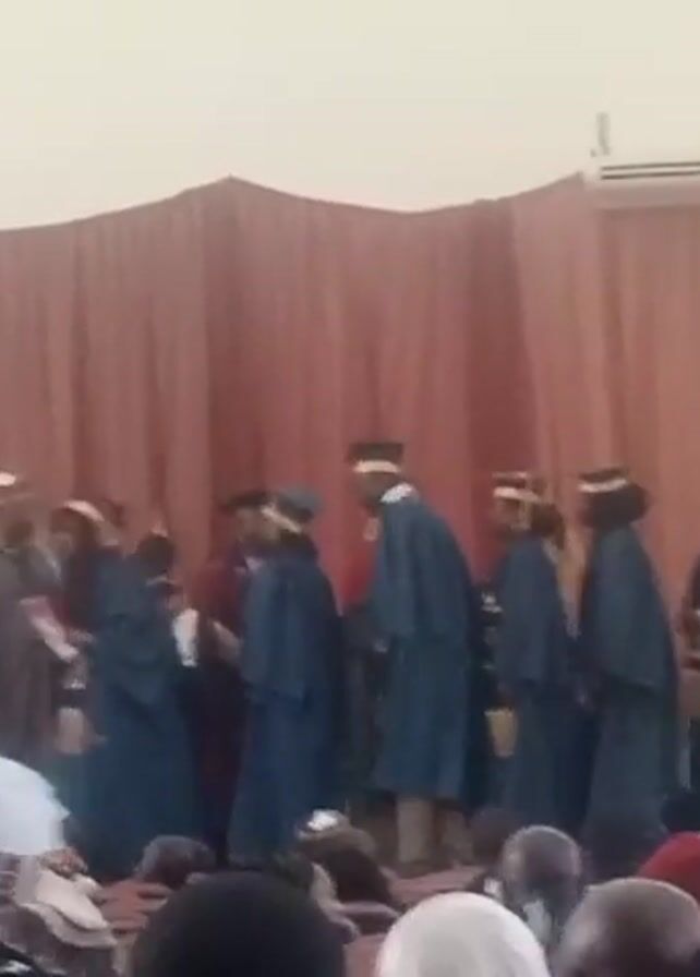 group of people on a stage in what appears to be an auditorium or large hall. A crowd is seated in front of the stage. The people on stage are wearing blue academic gowns and some have hats. A man in a suit is standing among them. There is a red curtain behind the group. Some people are moving and interacting on the stage. There are tables and chairs visible on the left side of the stage. An air conditioner is mounted high on the wall above the curtain. There is a banner visible on the left side, partially obscured. The lighting is bright.