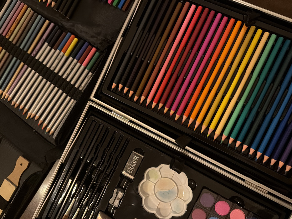 A detailed view of an art kit reveals a collection of colored pencils arranged in orderly rows, showcasing a diverse spectrum of hues