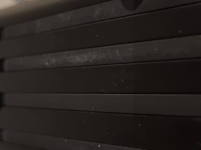 A close-up shot presents a stacked arrangement of dark, possibly black, horizontal bars. The surface texture appears slightly ridged or grooved. There is some dust or debris visible on the bars. The lighting is dim and uneven, contributing to a shadowed aesthetic. The bars are aligned and create a layered pattern.