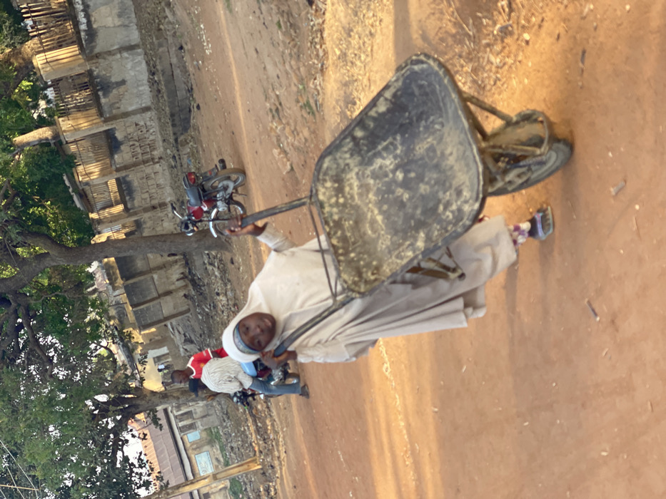 An individual is positioned on a dirt road, holding a wheelbarrow with both hands. The person wears a white garment and head covering. A red motorcycle is parked nearby. Several people are walking behind the wheelbarrow operator. Buildings are visible on the left side of the frame. The scene is captured during the daytime under sunny conditions.