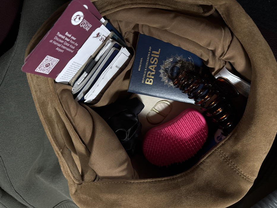 The image provides a detailed, top-down view into an open, light brown suede-textured handbag or tote bag, revealing its contents. The bag rests on a dark green, ribbed fabric surface. Inside the bag, various personal and travel-related items are present: * **Documents:** A stack of maroon-colored "Discover Qatar" brochures from Hamad International Airport is visible on the right side, with one prominently displaying a QR code and the text "Book your Travel tour from the Discover Qatar kiosk in Hamad International Airport." Beneath these are several white paper travel documents, some clearly showing the Qatar Airways logo, likely boarding passes or itineraries. * **Passport:** A dark blue Brazilian passport ("REPÚBLICA FEDERATIVA DO BRASIL" and "MERCOSUL" visible) is centrally positioned. * **Hair Accessories:** A bright pink detangling hairbrush is situated on the left. A dark brown, spiral-shaped hair claw clip rests on top of the Brazilian passport. A black satin or silk scrunchie is partially visible further to the left, nestled against the bag's interior lining. * **Other Items:** Partially obscured beneath the hairbrush, a light-colored item with a gold-colored "CD" logo is discernible, suggesting a small pouch or accessory. The presence of "Discover Qatar" and "Hamad International Airport" branded materials, along with Qatar Airways documents, definitively places the scene within **Hamad International Airport (DOH) in Doha, Qatar**. The arrangement of items suggests a traveler's personal effects, possibly being accessed or organized while in transit or awaiting travel.