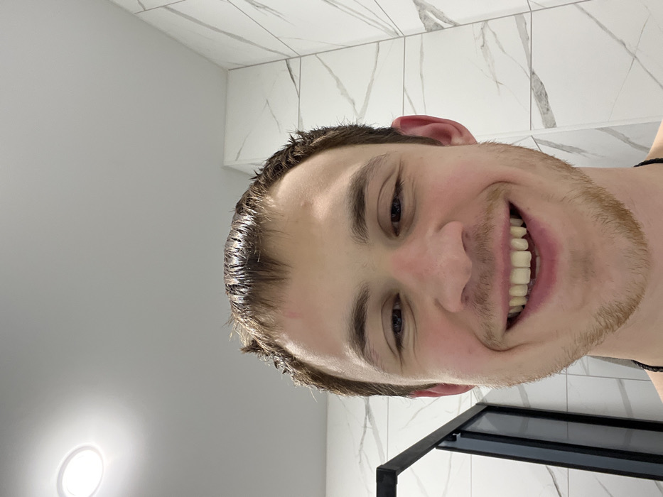 This image presents a close-up, upward-angled selfie of a young adult male taken in a bathroom in Tlustenkhabl, Russia. The male subject has short, wet, light brown hair and a light amount of facial stubble. He is smiling directly at the camera, displaying both upper and lower teeth. A subtle reddish mark is present on his forehead. A thin, dark cord, consistent with a necklace, is visible around his lower neck. The immediate background features a plain white ceiling with a single, circular recessed light fixture in the upper left. The walls are covered with large, rectangular white tiles exhibiting grey veining, suggesting a marble or stone pattern. A black-framed structure, likely part of a shower enclosure, is visible along the left edge of the frame.