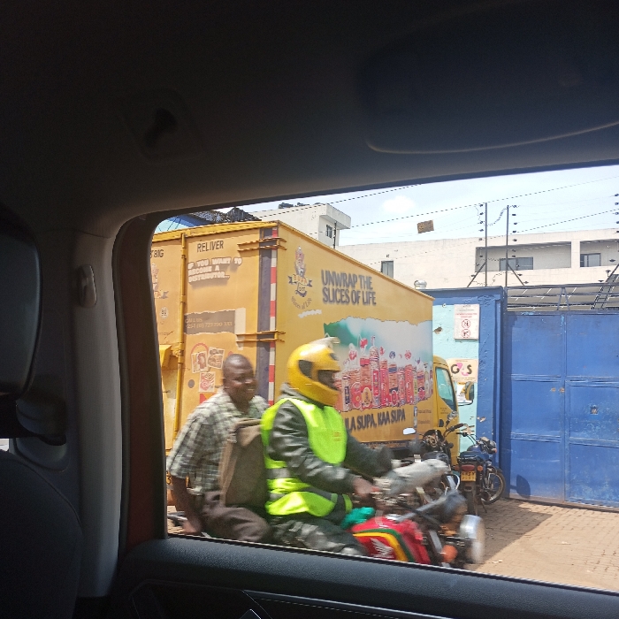 This image captures a street scene in Sheywe ward, Kenya, viewed from inside a vehicle looking out a side window. In the immediate foreground, parts of a dark gray vehicle interior are visible, including a headrest and window frame. The central subjects are two male individuals on a red and green Honda motorcycle, positioned to the right of the viewer's perspective. The driver wears a yellow full-face helmet, a dark long-sleeved jacket, and a neon yellow safety vest over it. His hands are on the handlebars, and his body is oriented forward. The passenger, seated behind the driver, wears a light-colored plaid shirt, dark pants, and has a brown shoulder bag or backpack. He is looking towards the camera with a slight smile. To the left and rear of the motorcycle is a large, yellow commercial delivery truck. The truck's side panel features branding including "UNWRAP THE SLICES OF LIFE" and "KAA SUPA, KAA SUPA," alongside images of various food products, likely bread or baked goods. Text promoting distributorship, "RELIVER," and phone numbers are also visible. Behind the delivery truck, a smaller blue commercial vehicle, possibly a three-wheeled cargo tuk-tuk, is partially visible. Further in the background, to the right of the yellow truck, is a solid blue industrial-style gate topped with barbed wire or an electric fence. Beyond the gate, a multi-story light-colored building with dark-framed windows is present under a partly cloudy sky. Another motorcycle is parked near the blue gate. The ground surface appears to be a reddish-brown earth or compacted dirt.