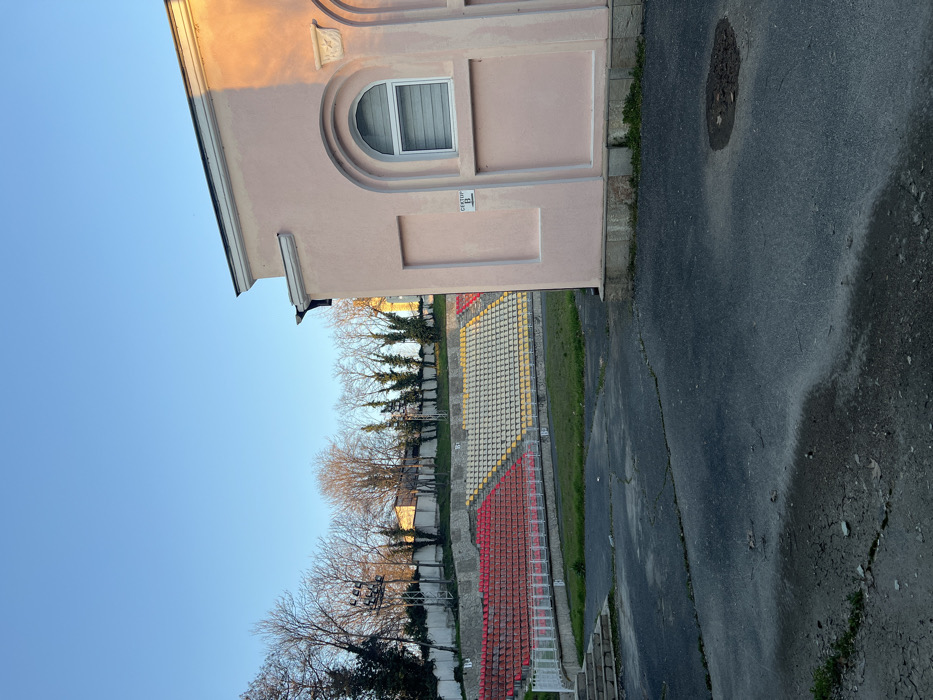 The image presents an exterior view of a stadium environment, specifically Sector B of the Arena Arda football stadium in Kardzhali, Bulgaria